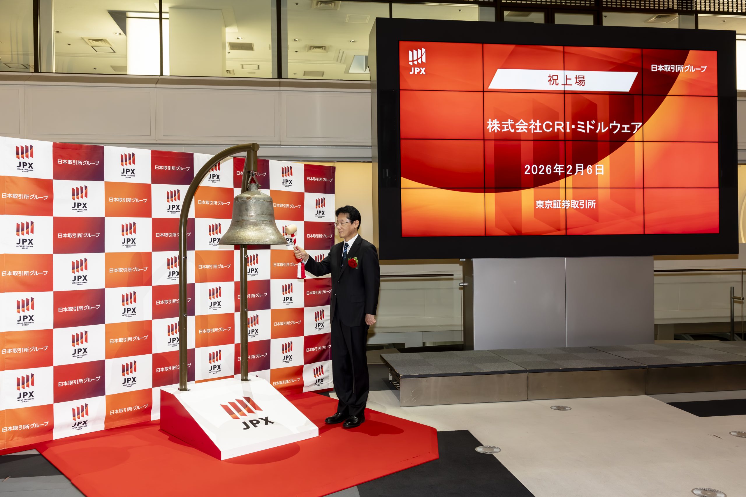 テレビなどで目にすることの多い上場セレモニーの会場で、経営陣が鐘を打つ場面もあり、終始穏やかな雰囲気に包まれていました。